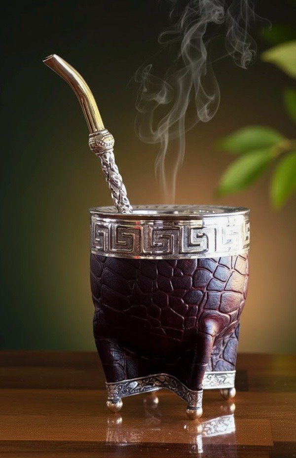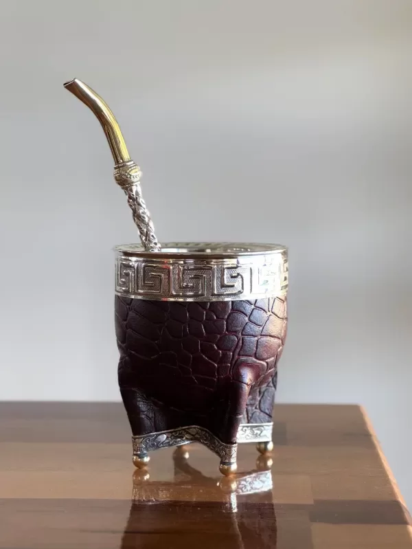 Confeccionado en cuero legítimo croco, detalles de alpaca artesanal y una base bolita dorada que le da elegancia y firmeza, este mate fusiona lujo y tradición. Perfecto para quienes disfrutan el ritual del mate con estilo, presencia y distinción.