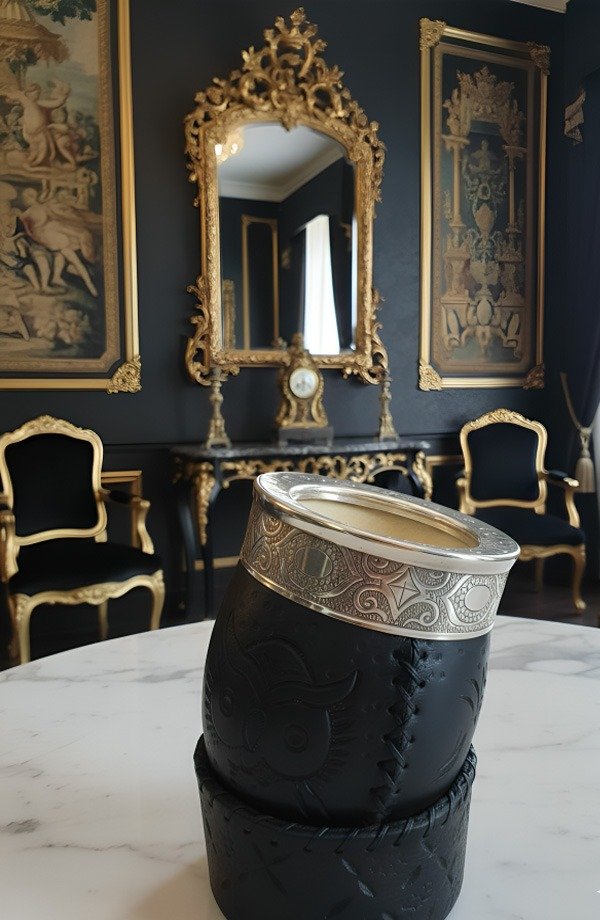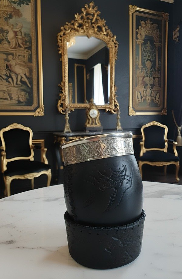 Sumérgete en la sofisticación con este mate de calabaza, envuelto en un sensual cuero vacuno negro labrado. Su virola de alpaca tallada, combinada con una base separada – también en cuero negro labrado y combinable – lo convierte en una pieza de diseño única. Elegancia oscura, glamour irresistible. ¡Completa tu look con este objeto de deseo! Adquiere el tuyo ahora.