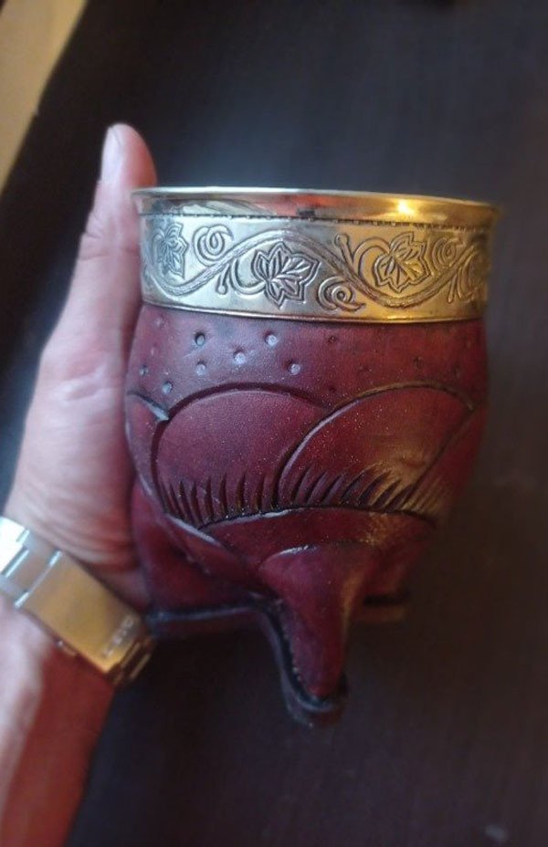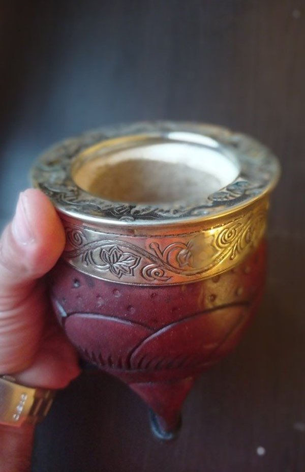 Un mate artesanal de cuero vacuno marrón, con detalles labrados a mano y una virola de alpaca, también labrada, que le da un toque de distinción. Su interior es de calabaza con boca ancha para un cebado perfecto. ¡Un mate único para disfrutar de la mejor yerba.