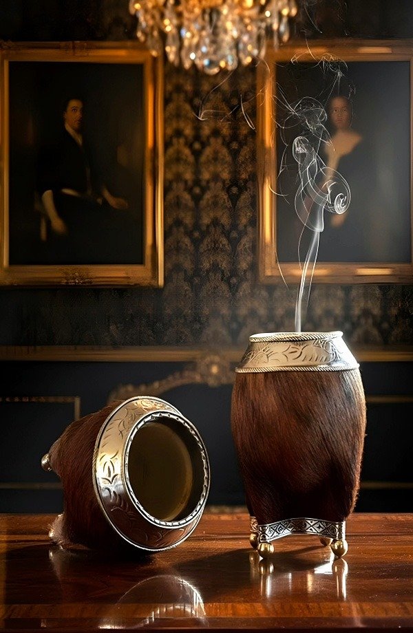 Experimenta el lujo artesanal con este mate de calabaza, finamente forrado en cuero vacuno marrón legítimo, con un exquisito labrado. El diseño Torpedo en bronce, símbolo de distinción, realza su belleza. Un objeto de deseo para paladares exigentes. Indulge en la perfección.